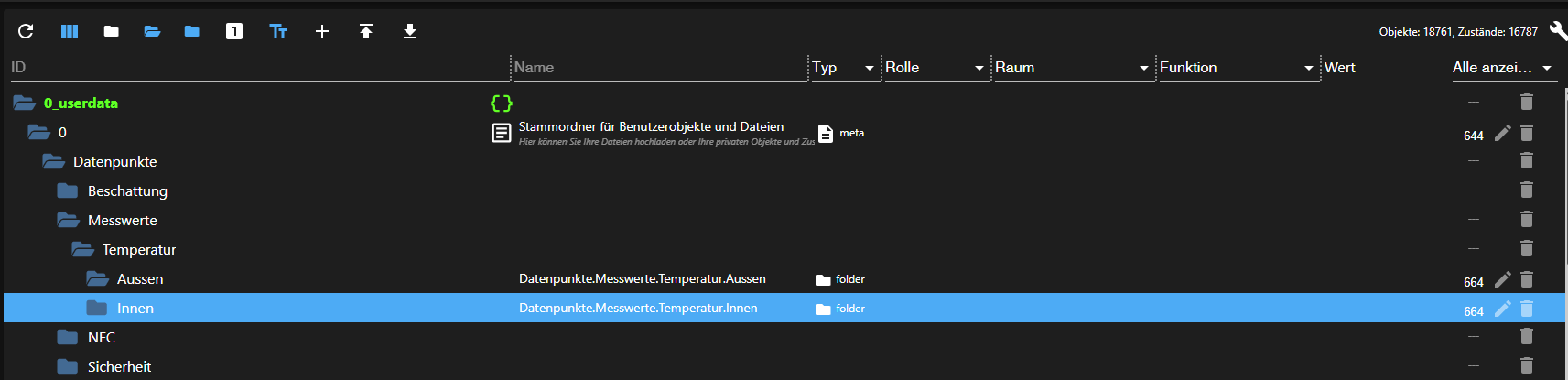 Nach dem Speichern der Konfiguration sehen wir nun in die Objekten die folgende Struktur. Über diesen Weg können wir weitere Datenpunkte anlegen.